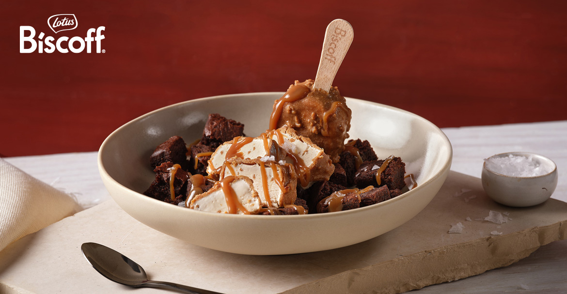 1. Browniewürfel kurz in Pfanne/Ofen anwärmen (nur warm, nicht trocken) 2. In Schälchen geben, Stieleis in Scheiben schneiden und drauflegen 3. Biscoff Creme drüber (kurz angewärmt = besserer Drizzle), optional Salzflocken.