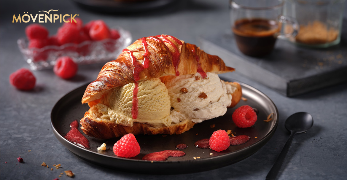 Himbeeren zusammen mit dem Puderzucker und etwas Zitronensaft pürieren und durch ein feines Sieb streichen. Die Croissants aufschneiden und mit Himbeersauce bestreichen. Je zwei Kugeln MÖVENPICK Eis (z.B. Bourbon Vanille & Maple Walnuts) in das Croissant geben. Mit etwas Himbeersauce und ganzen Himbeeren garnieren. TIPP: Funktioniert auch super mit Obst wie Mango oder Erdbeeren