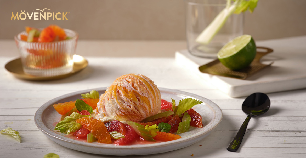 Von den Früchten etwas Schale abreiben und zur Seite stellen. Früchte schälen und filetieren und jeweils 5 Filets pro Dessert zur Seite legen. Von den restlichen Filets den Saft in einem Topf ausdrücken. Den gewonnenen Saft mit dem Schalenabrieb reduzieren und einkochen, bis die Masse dickflüssig wird. Mit Cointreau abschmecken. Staudensellerie schräg dünn schneiden und mit etwas Puderzucker süßen. Die Zitrusfrüchtefilets, die Reduktion und den Sellerie mischen. In einer separaten Schale Quark mit etwas Honig und etwas Limettensaft mischen. Einen Esslöffel der entstandenen Crème als Basis auf einen Teller streichen. Etwas Zitrusfrüchtemischung darauf verteilen. Eine Kugel MÖVENPICK Quark Mandarine Eis darauf geben und mit frischen Sellerieblättern dekorieren.
