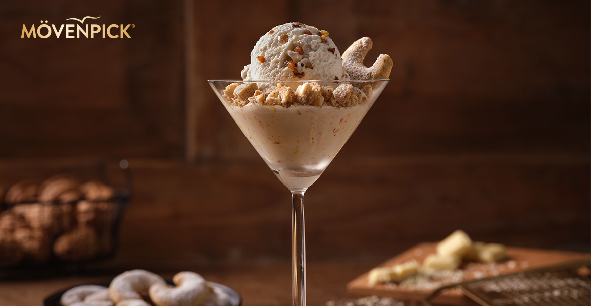 Vanillekipferl für die Deko zur Seite legen. Den Rest grob zerkleinern. Die weiße Schokolade schmelzen und die Schlagsahne zusammen mit dem Vanillezucker und Sahnesteif steifschlagen. Mascarpone, Quark, Vanille und Orangenabrieb glatt rühren. Die flüssige Schokolade unterrühren und anschließend die Schlagsahne unterheben. Eine Schicht Creme in das Glas füllen, die Keksbrösel darauf verteilen. Darauf eine Kugel MÖVENPICK Maple Walnuts geben. Für ca 30 Minuten kaltstellen. Vor dem Servieren mit den restlichen Vanillekipferl und Walnüssen garnieren.