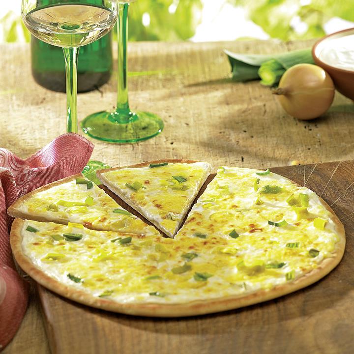 Flammkuchen belegt mit Käse, Lauch und Sauerrahm, tiefgefroren.Conveniencegrad