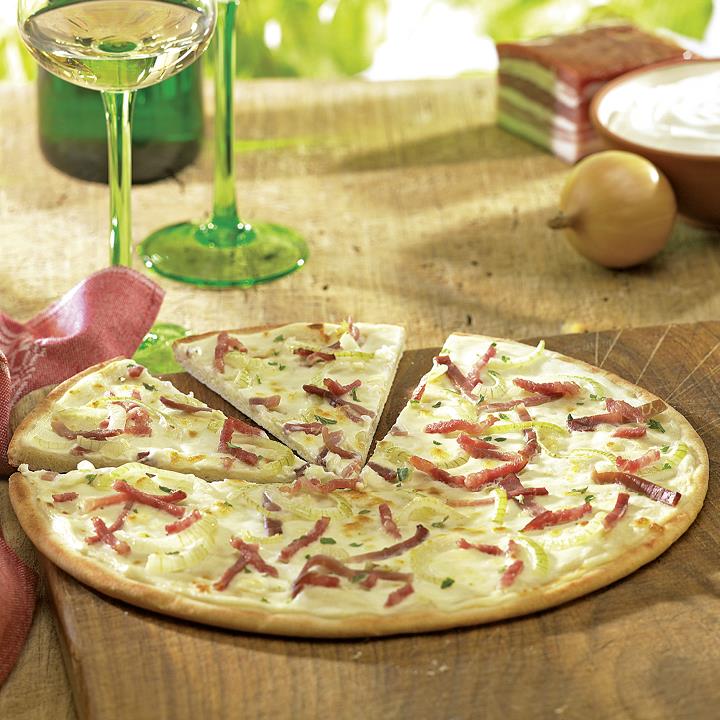Flammkuchen belegt mit geräuchtertem Schweinebauch, Rohschinken, Zwiebeln, Créme fraîche und Sahnejoghurt, tiefgefroren.Conveniencegrad