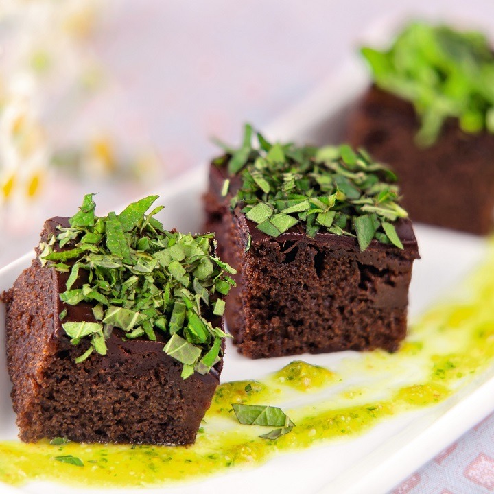 Dunkler Rührteigkuchen mit Schokoladencreme (21%) und Dekor aus kakaohaltiger Fettglasur (16%), tiefgefroren, vorgeschnitten in 3 Riegel.Conveniencegrad