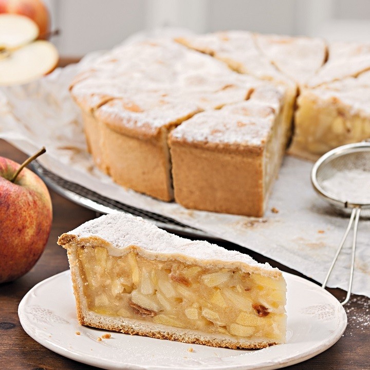 Mürbeteigkuchen mit Apfel-Füllung (71%), mit Tortenguss abgeglänzt und Dekorzucker abgepudert, tiefgefroren, vorgeschnitten in 14 Portionen.Conveniencegrad