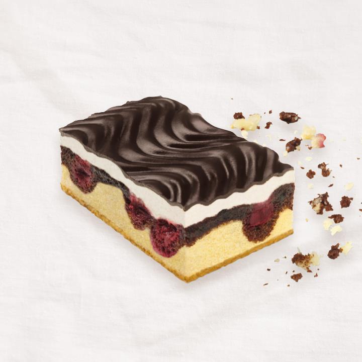 Sauerkirschen in dunklem und hellen Rührteig, mit heller Creme (29%) und kakaohaltiger Fettglasur, tiefgefroren, vorgeschnitten in 20 Portionen.Conveniencegrad