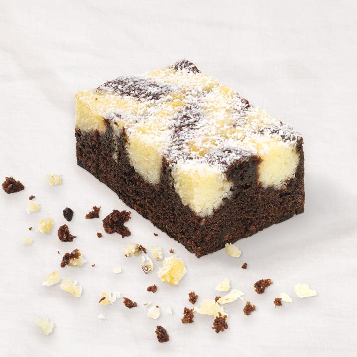 Schoko-Rührteigboden mit Kokosnuss-Füllung (32%), bestreut mit Kokosnuss-Raspeln (1%) und Tortenguss abgeglänzt, tiefgefroren, vorgeschnitten in 20 Portionen.Conveniencegrad