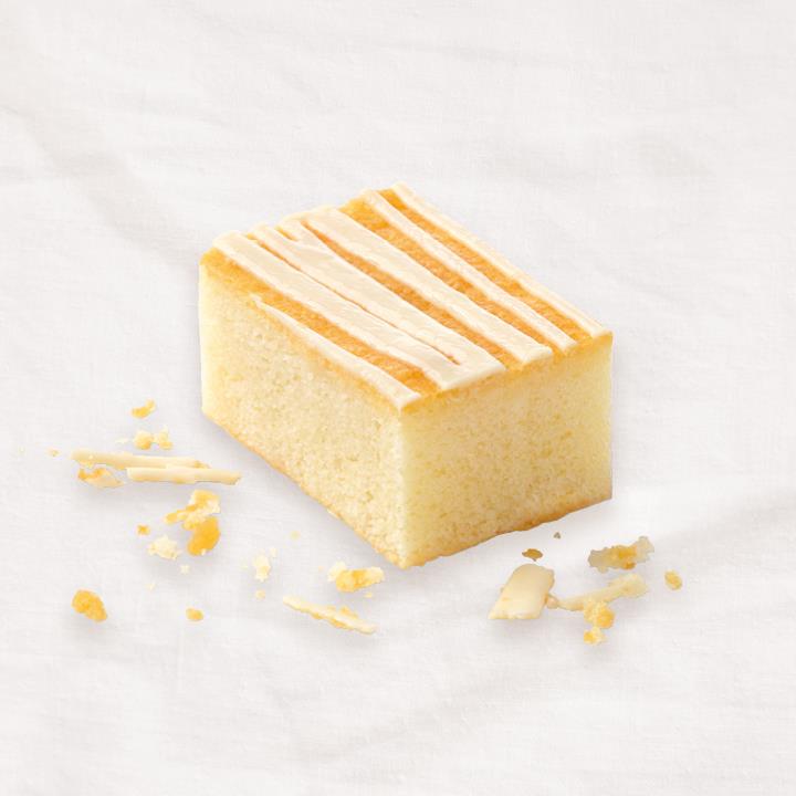 Zitronenkuchen (95%) mit Streifen aus heller Fettglasur (5%), tiefgefroren, vorgeschnitten in 32 Portionen.Conveniencegrad
