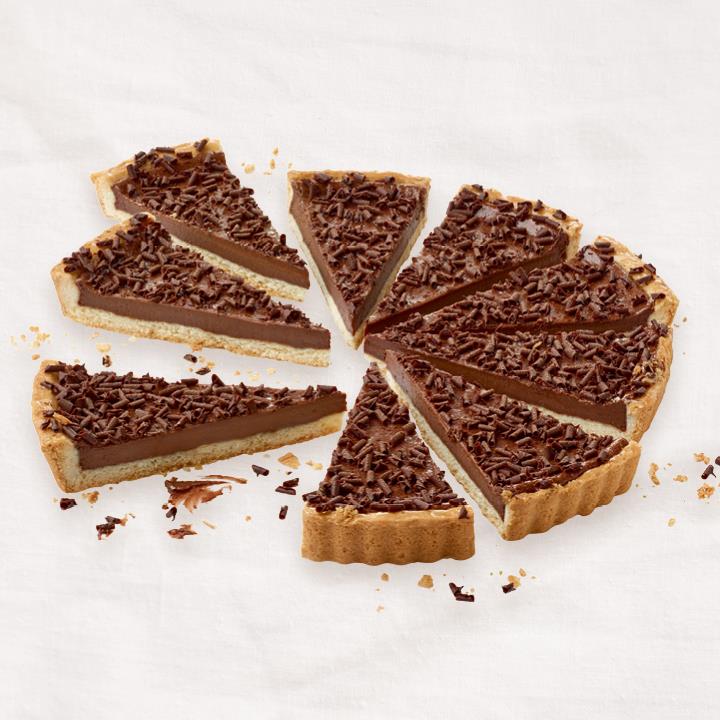 Mürbeteigboden mit Schokoladenkrem-Füllung (58%), mit Tortenguss abgeglänzt und Schokoladenraspeln (4%) bestreut, tiefgefroren, vorgeschnitten in 12 Portionen.Conveniencegrad