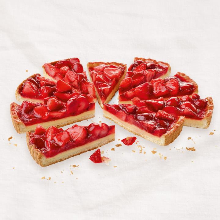 Mürbeteigboden mit Eicreme (24%) und halben Erdbeeren, mit Tortenguss abgeglänzt, tiefgefroren, vorgeschnitten in 12 Portionen.Conveniencegrad