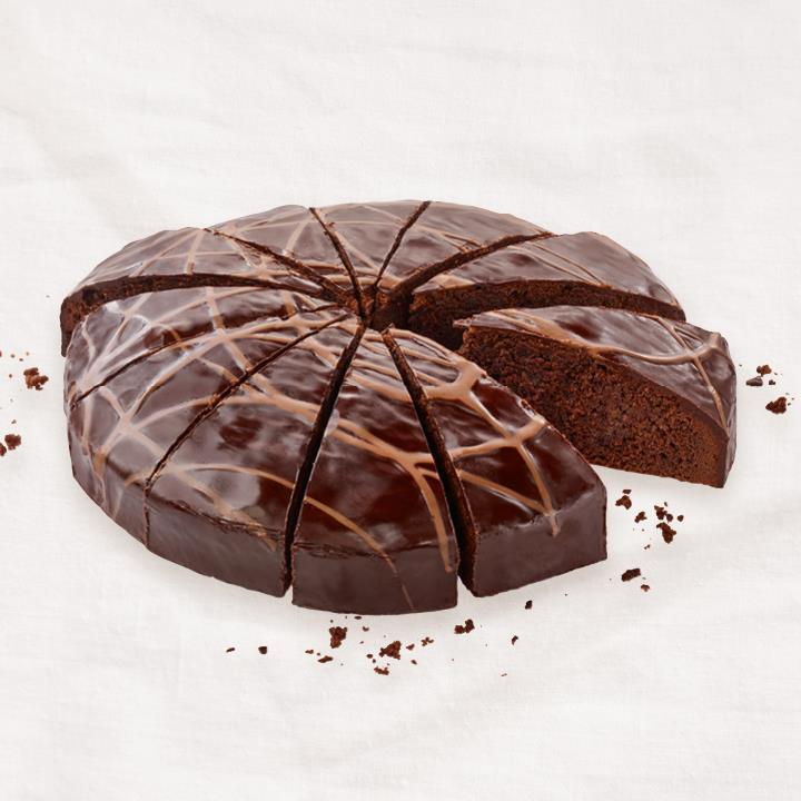 Dunkler Rührteig mit eingeimpfter Schokocreme (20%), dekoriert mit kakaohaltiger Fettglasur und Nougatcreme, tiefgefroren, vorgeschnitten in 12 Portionen.Conveniencegrad