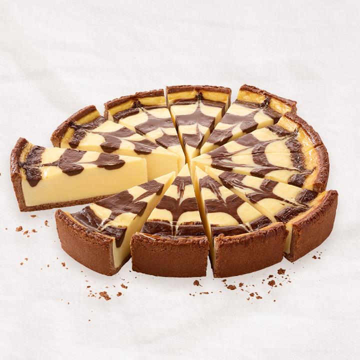 Marmorierter Käsekuchen aus dunklem Mürbeteigboden, Käsemasse (71%) und kakaohaltiger Käsemasse (8%), mit Tortenguss abgeglänzt, tiefgefroren, vorgeschnitten in 12 Portionen.Conveniencegrad