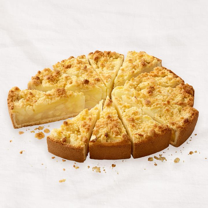 Mürbeteigboden mit Apfelfüllung (52%), Apfelspalten (17%) und Butterstreuseln (6%), mit Tortenguss abgeglänzt, tiefgefroren, vorgeschnitten in 12 Portionen.Conveniencegrad