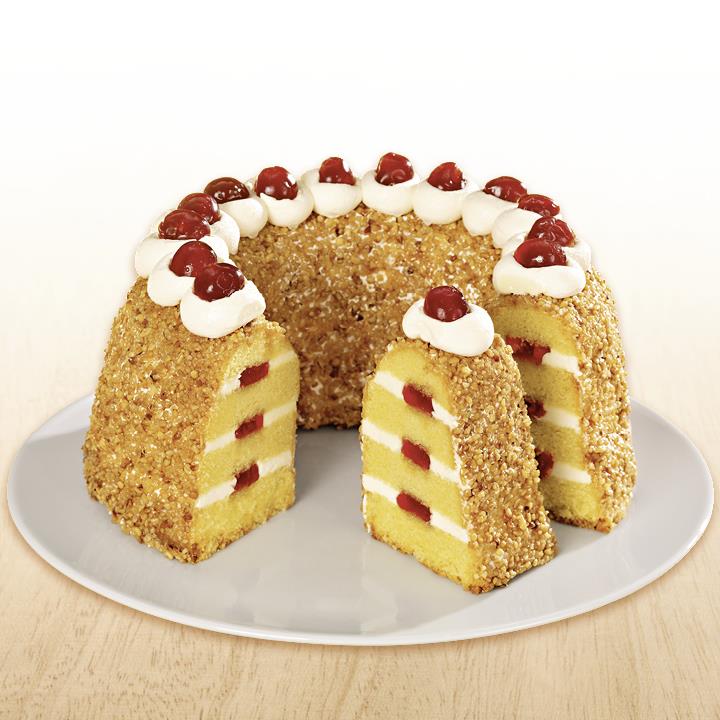 Frankfurter Kranz, gefüllt mit einer Buttercreme und mit einer Vierfrucht-Füllung, garniert mit 18 Creme-Tupfen und 18 halbierten Belegkirschen, tiefgefroren.Conveniencegrad