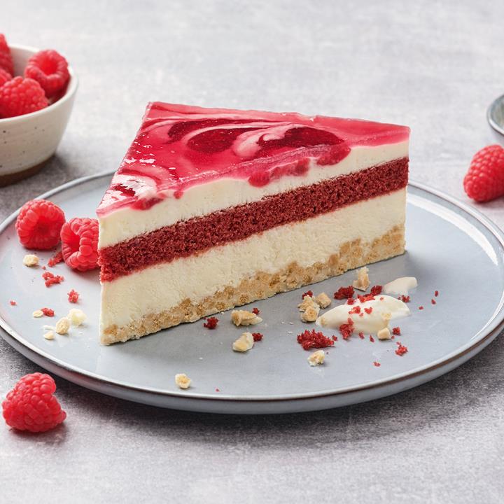 Auf einem Boden aus Knusperweizen und heller Fettglasur liegt eine Vanille-Sahne-Füllung (29%), hierauf ein roter Rührteigboden, bedeckt mit Vanille-Sahne-Füllung (18%) und Himbeer-Zubereitung (6%), mit Tortenguss abgeglänzt, tiefgefroren, vorgeschnitten in 12 Portionen.Conveniencegrad