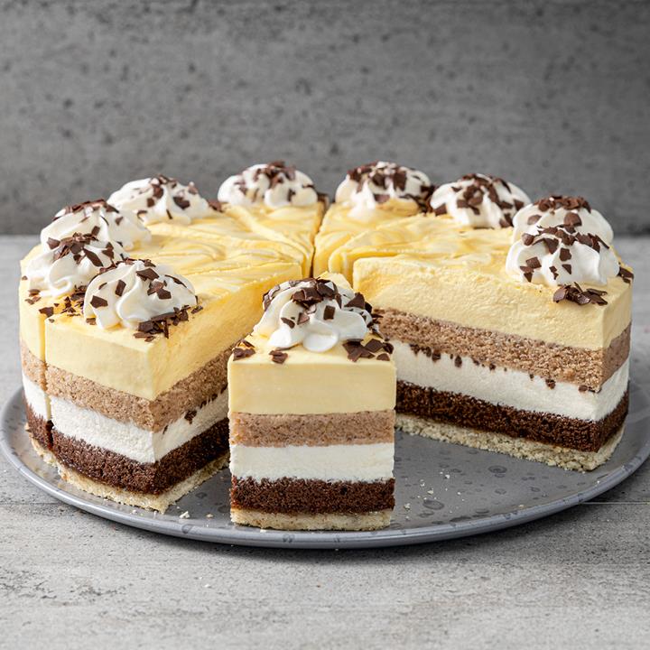 Auf einem Mürbeteigboden liegt zwischen einem dunklen und einem Nuss-Rührteigboden eine Vanille-Sahne-Füllung (25%) mit Schokoladenstückchen, bedeckt mit einer Eierlikör-Creme (30%) und verstudelter Eierlikör-Soße (6%), dekoriert mit Sahnetupfen und Schokoladenraspeln, tiefgefroren, vorgeschnitten in 12 Portionen.Conveniencegrad