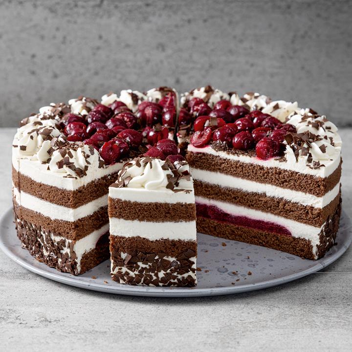 Dunkle Wiener Böden mit Sauerkirschzubereitung (12%) und kirschwasserhaltigen Sahnefüllungen (38%), mit Sahnetupfen, Sauerkirschen (7%) und Schokoladen-Raspeln dekoriert, vorgeschnitten in 12 Portionen, tiefgefroren. Enthält Alkohol. Für Kinder nicht geeignet.Conveniencegrad
