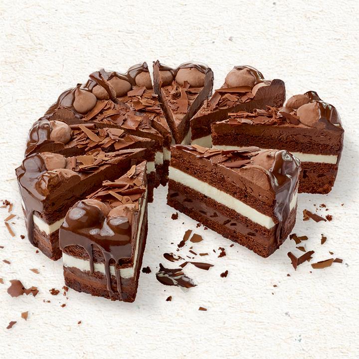 Zwischen zwei Schokoladenrührteigböden befindet sich eine Kakaocreme (15%) mit Milchschokoladenstückchen, hierauf eine helle Creme (15%) und Schokoladenrührteigböden, bedeckt mit einer Kakaocreme (15%), dekoriert mit Schokoladenraspeln, Tupfen aus Kakao-Garniercreme (7%) und einer am Rand verlaufenenen Kakaocreme (3%), tiefgefroren, vorgeschnitten in 12 Portionen.Conveniencegrad